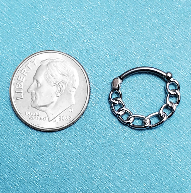 Give your look a bold edge with the Surgical Steel Chain Septum Ring — sleek, sturdy, and seriously striking.